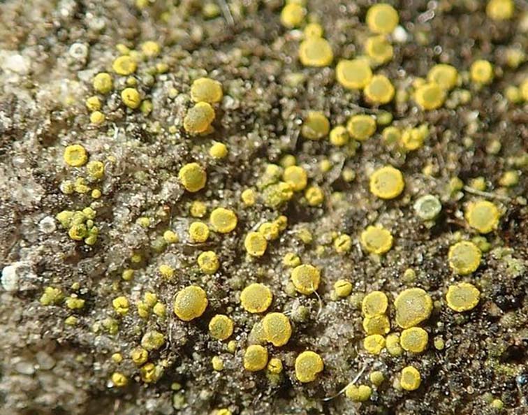Таллом очень маленький, мелкозернистый, бородавчатый, нередко состоящий из рассеянных, обособленных мелких чешуек. Апотеции встречаются изредка, мелкие, 0,2–1 мм в диаметре. Диск сначала плоский, затем выпуклый, цвета воска до жёлто-оранжевого цвета, окружённый тонким, цельным или лепрозным слоевищным краем. Эпитеций высотой 3–5 мкм, бледно-жёлтый, зернистый. Гипотеций высотой 70–80 мкм, бесцветный. Гимений высотой 65–75 мкм, бесцветный. Парафизы рыхло соединённые, простые, на верхушках головчато утолщённые. Сумки вздуто-булавовидные, с 8–32 спорами. Споры бесцветные, продолговатые, эллипсоидные или яйцевидные, прямые или слабоизогнутые, одно- или ложнодвуклеточные, 9⁠–⁠12 × 4–5,2 мкм, с тонкой перегородкой и тонкой оболочкой. Пикнидии очень мелкие, точковидные, жёлтые.
