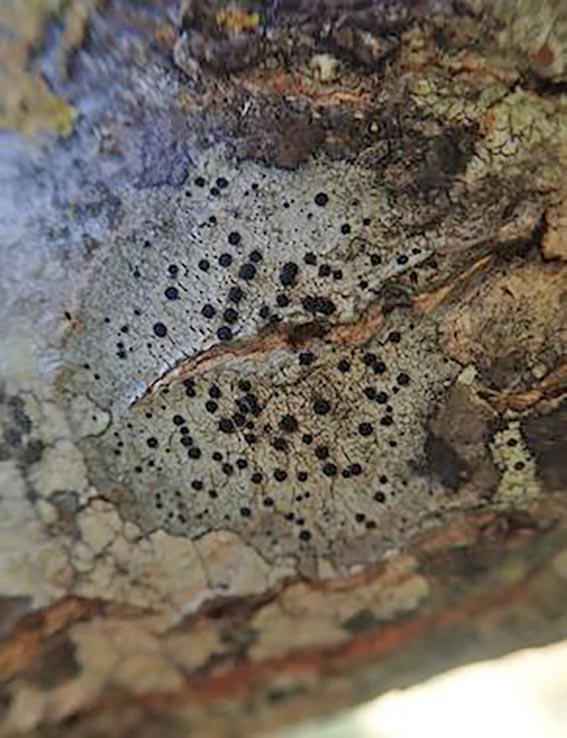 Таллом накипной, от очень тонкой до толстой, зернистой, трещиновато-ареолированной корочки, от коричневого до серого цвета. Фотобионт — одноклеточная зелёная водоросль рода требуксия (Trebouxia Pyum). Апотеции чёрные, лецидеевого типа, обычно с сохраняющимся краем, от погружённых до сидячих, полностью прижатых или слегка суженных у основания. Собственный край апотеция (эксципул) образован радиально расходящимися гифами, обычно окрашенными в верхней части. Эпигимений от коричневого до зелёного. Гимений без капель масла. Гипотеций тёмно-коричневый, реже светлый. Парафизы разветвлённые или простые, концы парафиз расширены и окрашены. В сумке по 8 спор. Споры коричневые 2‑клеточные, прямые или слегка изогнутые. Конидии очень тонкие, длинные и дугообразные, 15–30 мкм длиной.