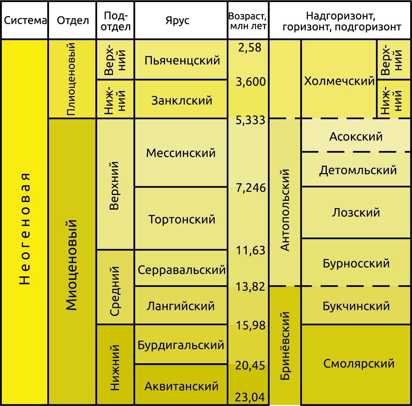 Следует после палеогеновой системы (периода), предшествует четвертичной системе (периоду).