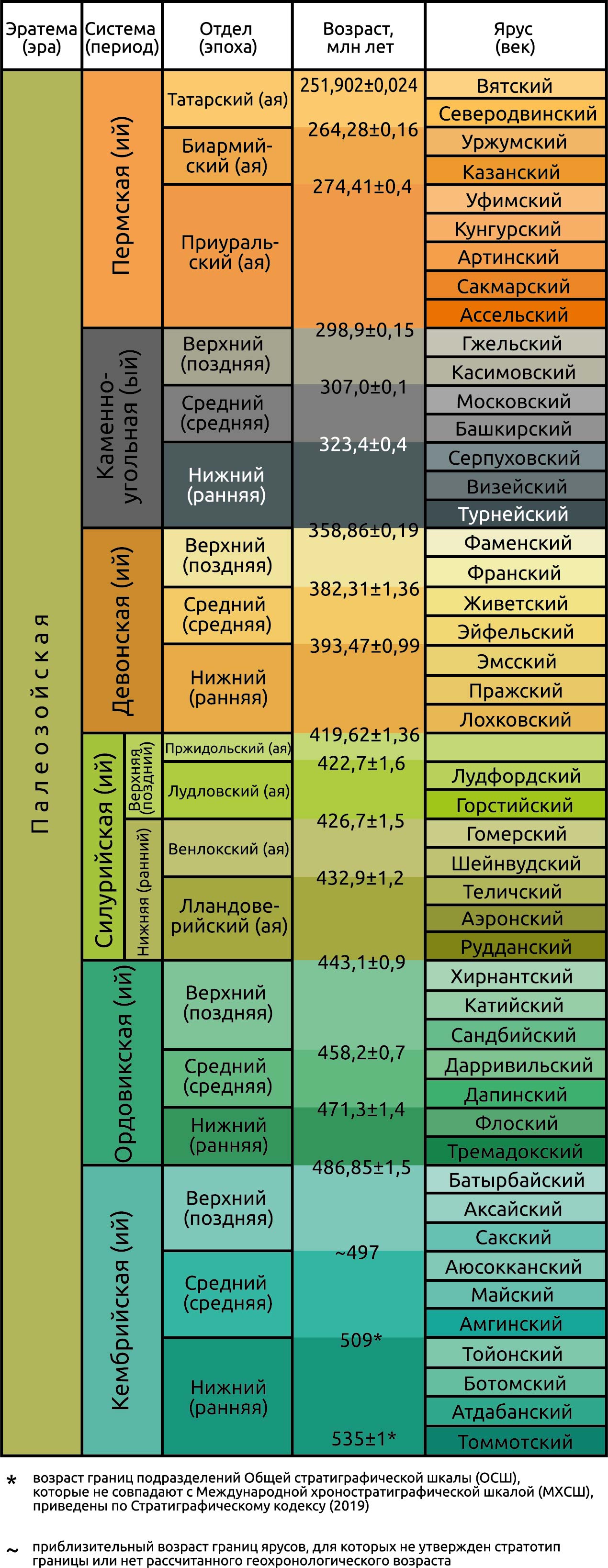 Палеозой состоит из кембрийской системы (периода), ордовикской системы (периода), силурийской системы (периода), девонской системы (периода), каменноугольной системы (периода) и пермской системы (периода), подразделяемых на 17 отделов геологических (эпох) и 42 яруса геологических (века); см. таблицу.