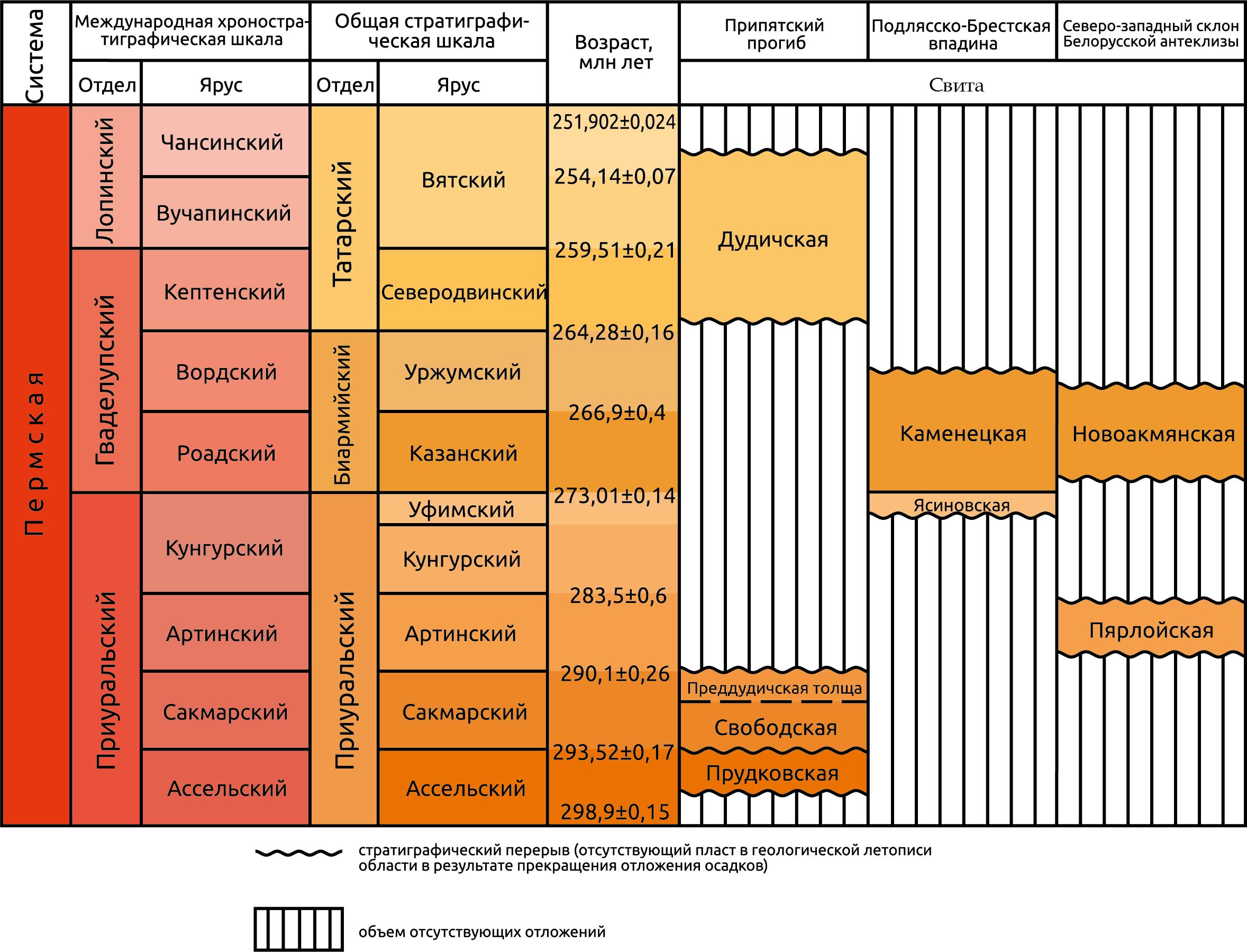 В МХСШ и белорусской Стратиграфической шкале (2017) пермская система подразделяется на 3 отдела геологических (эпохи) и 9 ярусов геологических (веков). Однако не существует общепринятой схемы расчленения системы на ярусы с их названиями: в разных странах приняты свои подразделения. В Беларуси деление пермской системы отличается от МХСШ и соответствует Общей стратиграфической шкале (2024): нижний (приуральский) отдел включает ассельский, сакмарский, артинский, кунгурский и уфимский ярусы; средний (биармийский) — казанский и уржумский; верхний (татарский) — северодвинский и вятский ярусы; см. таблицу. Принятые в Беларуси ярусы пермской системы впервые выделили на территории России российские геологи В. Е. Руженцев, А. П. Карпинский, А. А. Штукенберг, А. В. Нечаев, Г. Н. Фредери́кс и др.