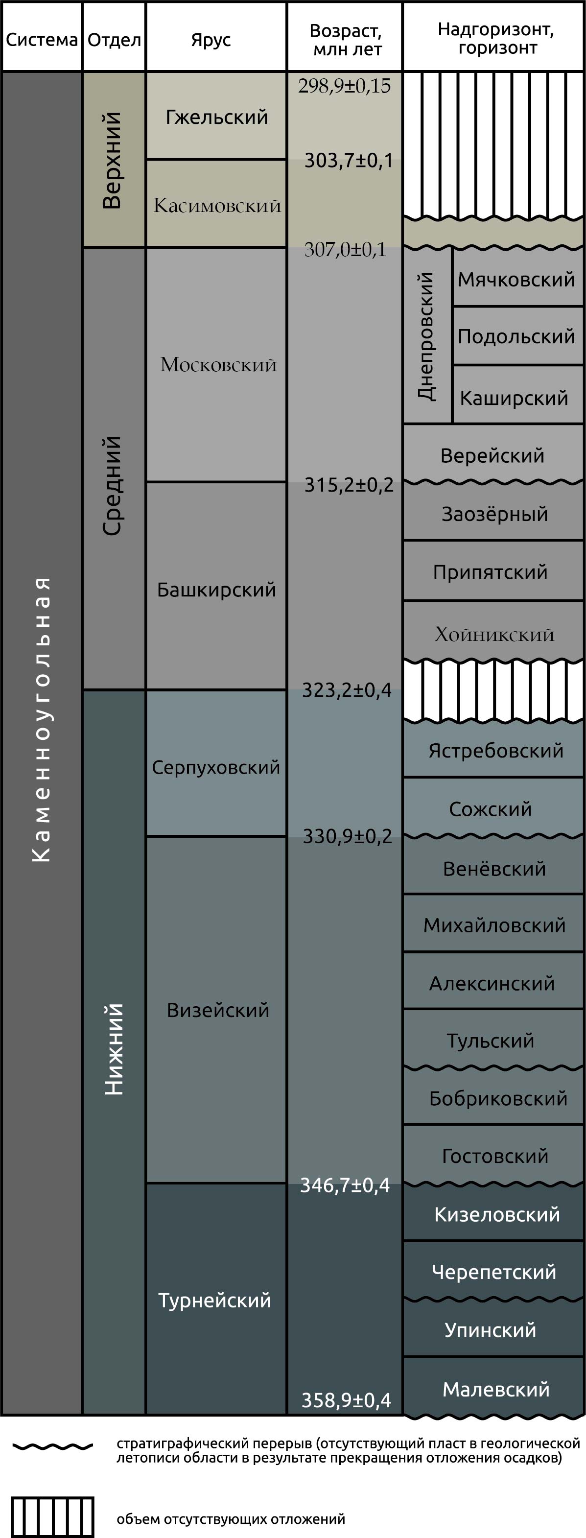 В ней принято деление карбона на 3 отдела: нижний, средний и верхний. Наряду с международными (общими) стратиграфическими подразделениями выделены региональные — надгоризонты и на основании биостратиграфических зон и лон (по миоспорам и макро- и микрофауне) горизонты. Нижнему отделу соответствуют ярусы — турнейский (включает горизонты малёвский, упинский, черепетский и кизеловский), визейский (гостовский, бобриковский, тульский, алексинский, михайловский и венёвский) и серпуховский (сожский и ястребовский); среднему — башкирский (включает хойникский, припятский и заозёрный горизонты) и московский (верейский), каширский, подольский и мячковский горизонты объединены в днепровский надгоризонт; верхнему — касимовский ярус (представлен своей нижней частью), отложения верхней части касимовского и гжельского яруса на территории Беларуси отсутствуют; см. таблицу. Стратиграфическая схема каменноугольных отложений также представлена местными стратиграфическими подразделениями — свитами геологическими и подсвитами.
