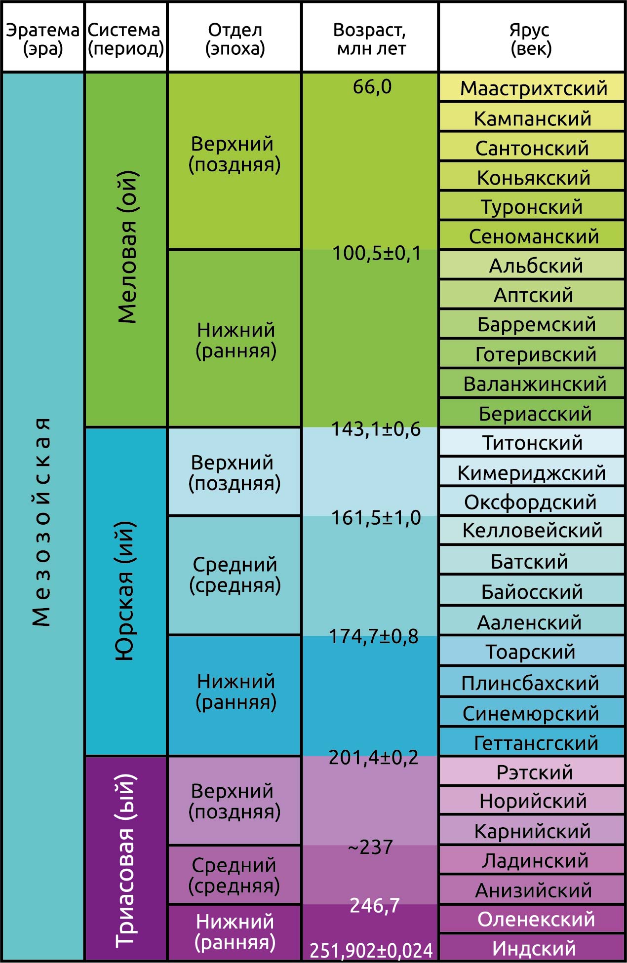 Мезозойская эратема включает триасовую систему (период), юрскую систему (период) и меловую систему (период). Подразделяется на 8 отделов (эпох) и 30 ярусов (веков).