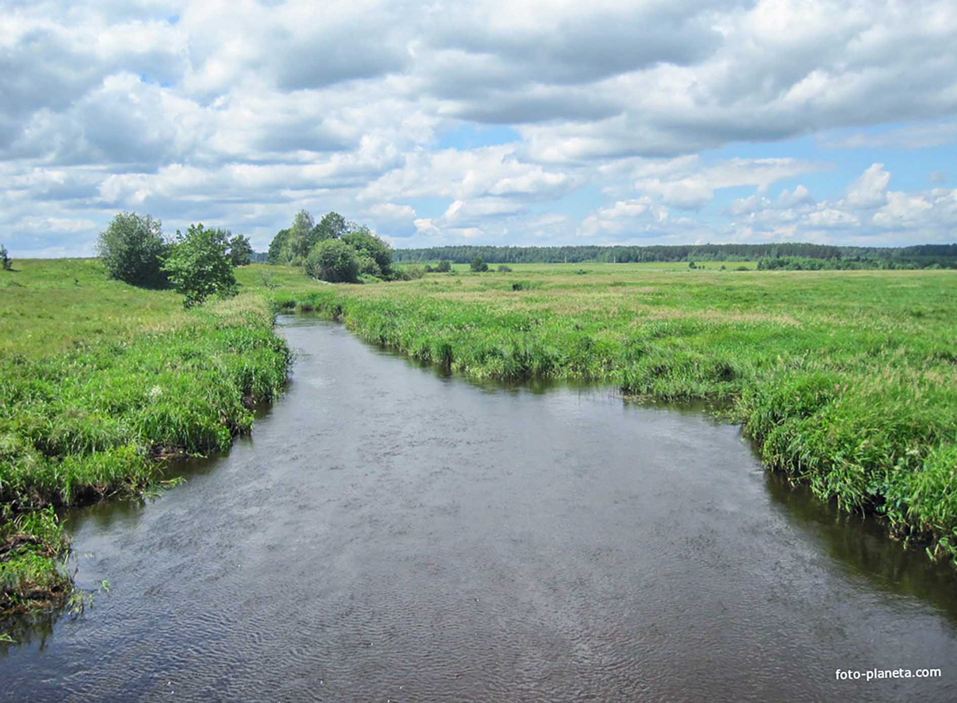 Пойма двухсторонняя, луговая, в верхней части заболоченная, под кустарником или лесом, шириной 100–300 м.